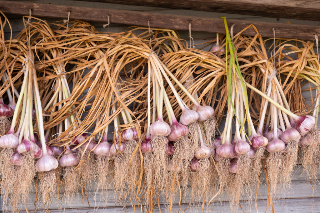 Cure the bulbs by either hanging them in bundles or laying them out on a screen or shelf in a cool, dry, well-ventilated spot for 2–4 weeks. A garage or covered porch works well. The garlic is fully cured when the outer skins are dry and papery and the necks are crispy.