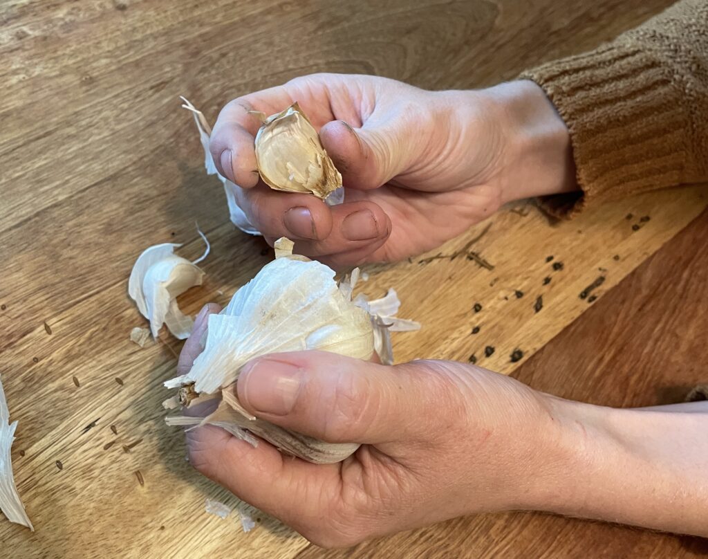 1. Break Apart the Bulb – Just before planting, gently separate the bulb into individual cloves. Keep the papery skins on—they protect the cloves from rot.
