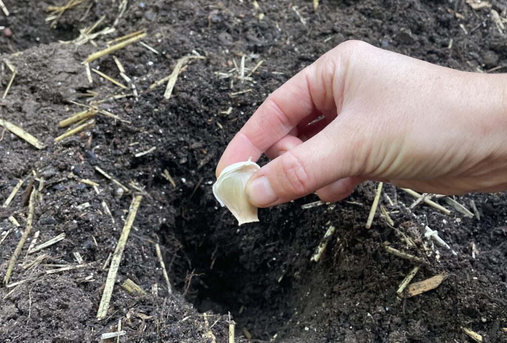 1. Plant the Cloves – Space cloves about 6 inches apart in rows 12 inches apart. Plant each clove with the pointy side up and the flat root end down. Bury them 2–3 inches deep (about 2-3 times the height of the clove).